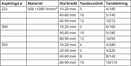I tabellerna syns de rekommendationer som ges för tanddelningen utifrån kapklingans storlek, material och godstjockleken. Rekommendationerna gäller för våra HSS-DM05-kapklingor från italienska Taube.